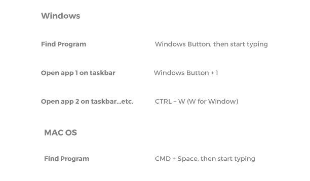 Finally, another great set of shortcuts to help you open and find programs on your computer. These differ between operating systems.