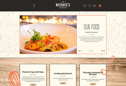 With such organic beginnings, we knew the design needed to evoke the heart of the project. We wanted the menus and logo to conjure that feeling of family, both welcoming and casual, intimate and understated. We went with hand drawn elements to create the logo and certain features including the utensils, food and creative words, all of which are displayed throughout the site and print materials. This, we felt, would emphasize the hand crafting that went into creating the meals, at first at Bernie’s home, and then to this day, at Bernie’s the restaurant.