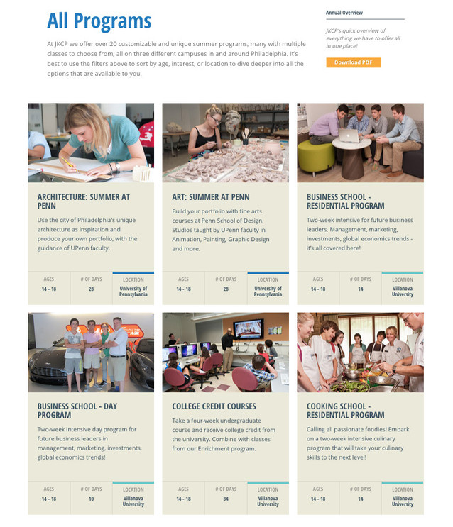 JKCP approached AYC Media to create a fully admin-controlled and responsive website that would intuitively guide users through the sign-up process to build a custom summer experience from a vast list of programs, classes and campuses.